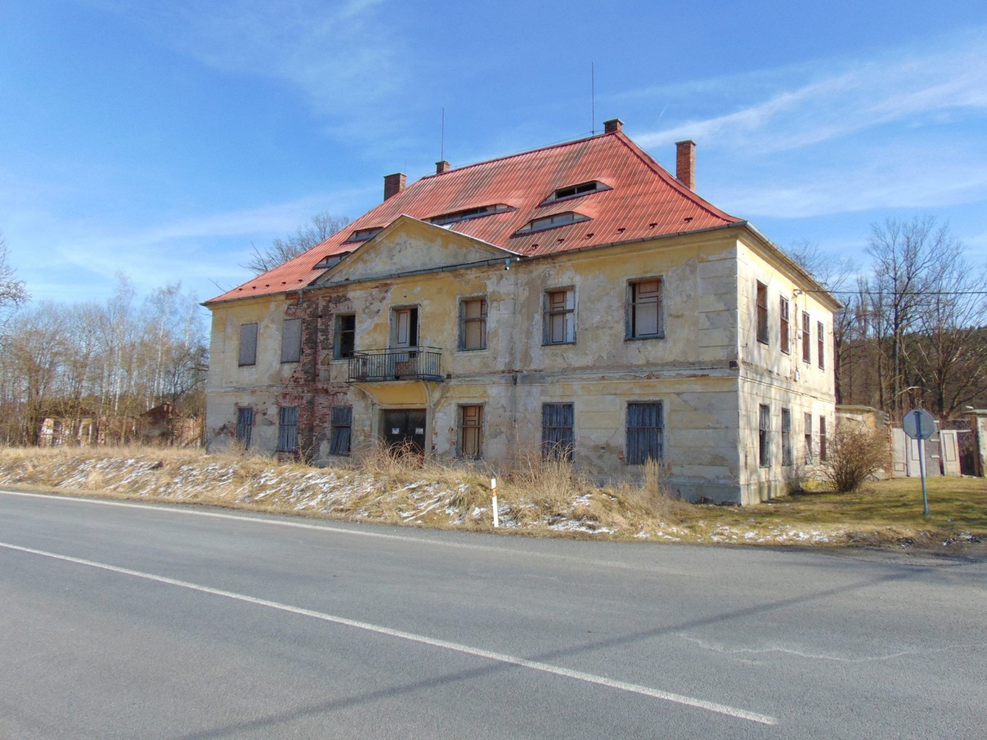 Klasicistní zámeček z doby kolem roku 1834 nechal vystavět Gottlieb Henneberg-Spiegl při tehdy budované císařské silnici. S narůstající dopravou byl zámek přebudován na zájezdní hostinec. Areál spoluutváří hospodářská budova a ohradní zeď. Areál představuje hodnotný doklad venkovské komerční a obytné usedlosti v klasicistním slohu.